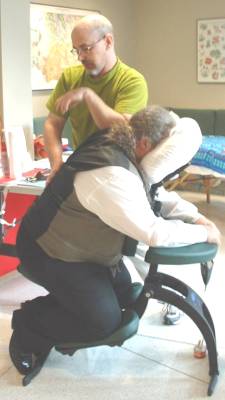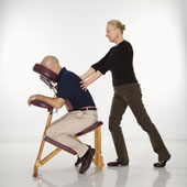 | Chair Massage is a brief, stress-reducing massage given to an employee seated in a comfortable, supportive and portable chair. The massage chair is supplied by the practitioner and can be set up quickly in almost any location. Chair Massage * Lasts from 5 to 30 minutes. * Uses no oil and is applied directly through clothing. * Is given by a massage practitioner professionally trained in effective, safe, seated massage techniques. * Addresses tension primarily in the upper body (back, neck, shoulders, scalp, arms, and hands), but creates an overall sense of well-being. * Leaves employees feeling relaxed, refreshed and ready to return to work. |
